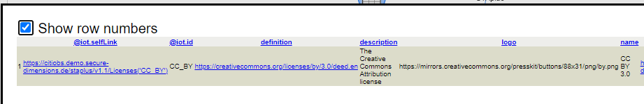 Some Creative Commons licenses are already created in the STA plus, so in this case we will use the Licenses to request all the licences in the STA. Then by right clicking in the Licenses we will add the Select Row tool (the one with a blue icon) and by doubleclicking in it, we can select the license we want. In this case, we will select CC-BY.