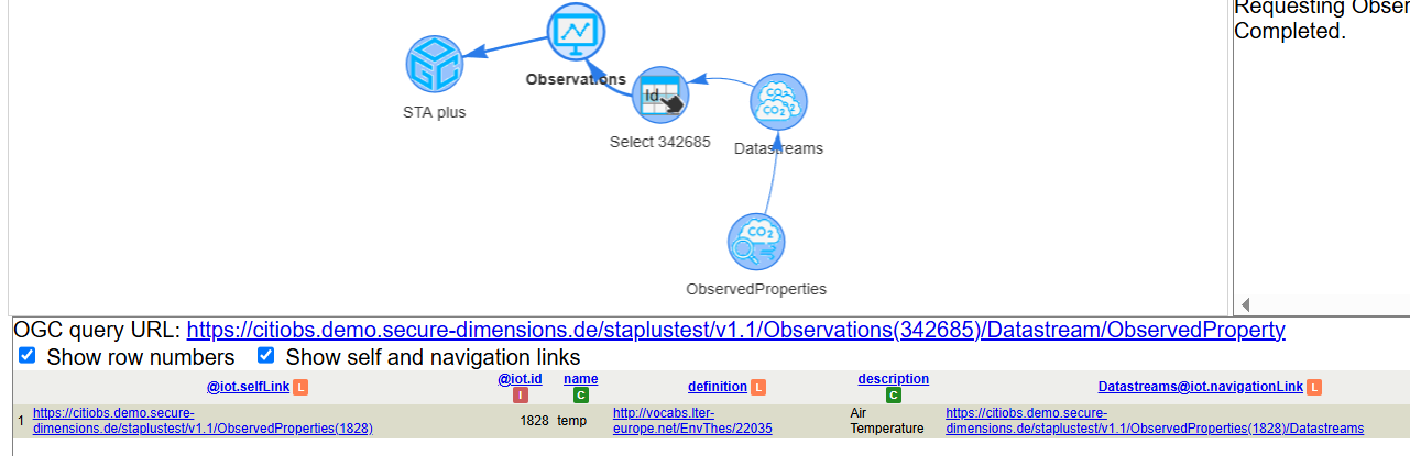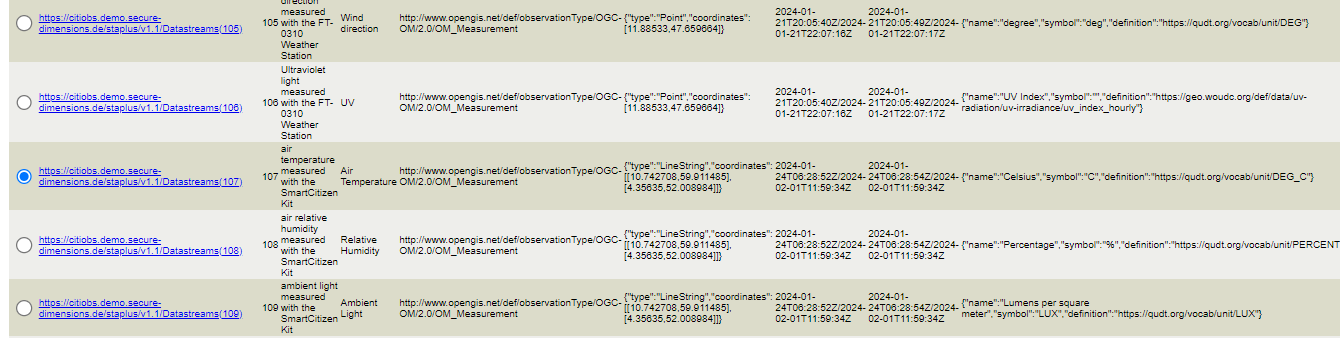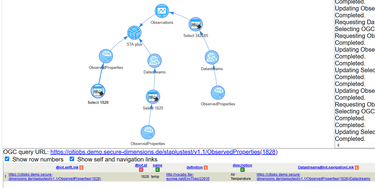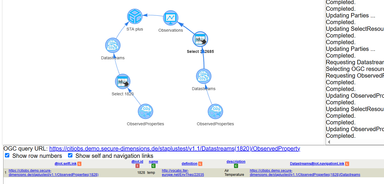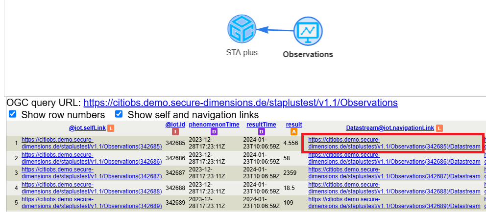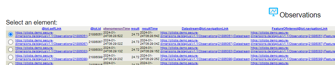 A partial result of the created observation group can be retrieved from the following query: https://citiobs.demo.secure-dimensions.de/staplustest/v1.1/ObservationGroups(232753)?$expand=Observations($select=result,phenomenonTime;$expand=Datastream($select=description;$expand=ObservedProperty($select=description)))
