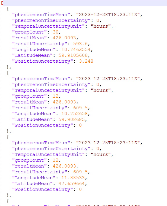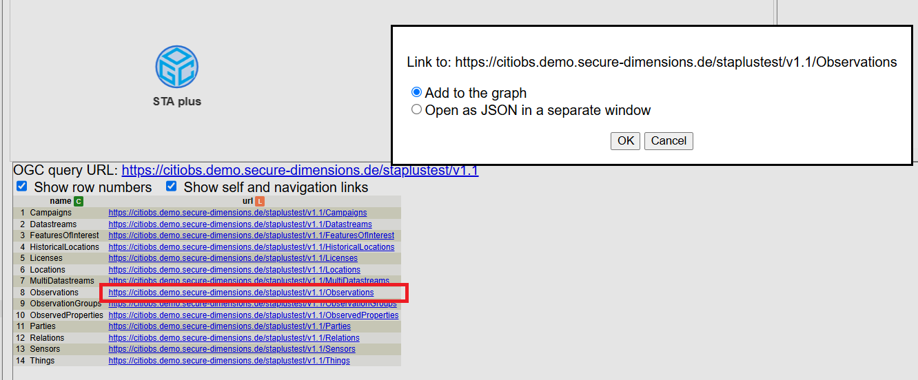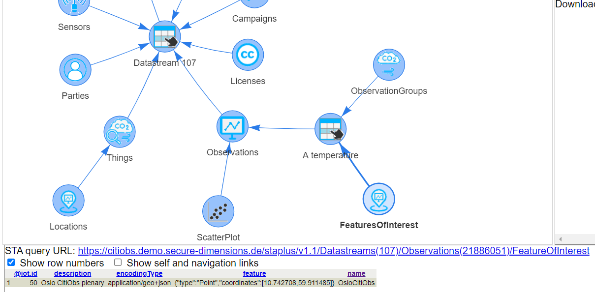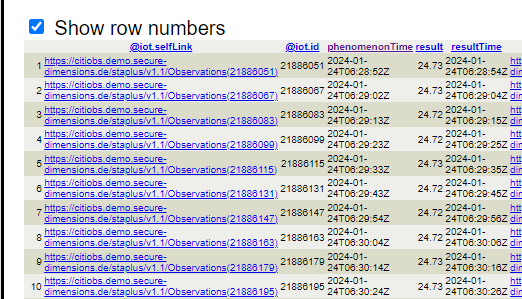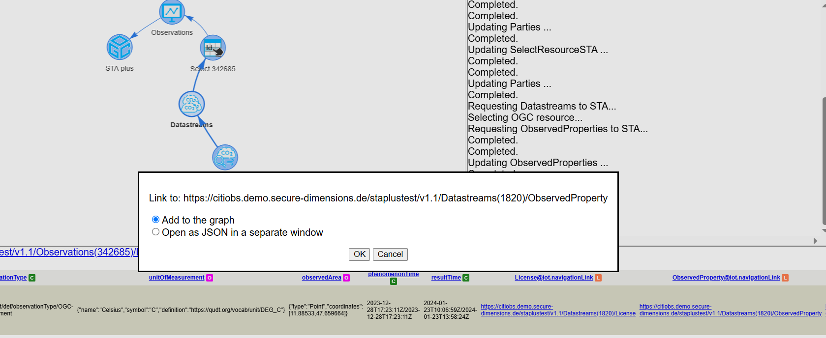 A partial result of the created observation group can be retrieved from the following query: https://citiobs.demo.secure-dimensions.de/staplustest/v1.1/ObservationGroups(232753)?$expand=Observations($select=result,phenomenonTime;$expand=Datastream($select=description;$expand=ObservedProperty($select=description)))