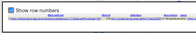 Finally, there is still an obvious way to present the same "ObservedProperty" and this is by clicking of the "@iot.selfLink" one of the two representations of the "ObservedProperty".