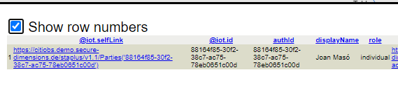 Then we can request the list of parties available by using the "Parties" tool. We can then see all parties by using the "Table" tool or even better, see the same list and select one from the list using the "Select Row" tool. We are selecting the "Joan Maso" party.