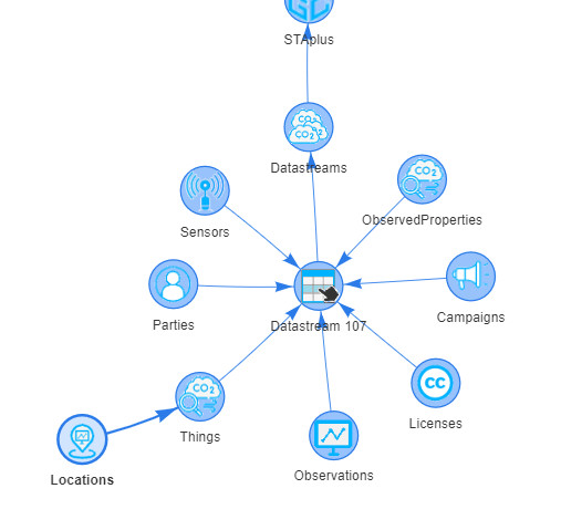 DataStream is a complicated object that is connected to Sensor, Thing, ObservedProperty, Party and License.