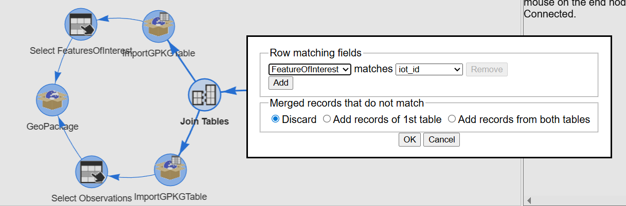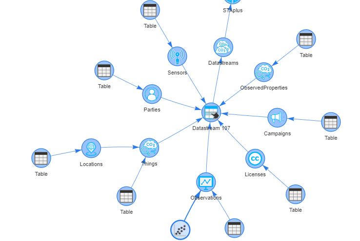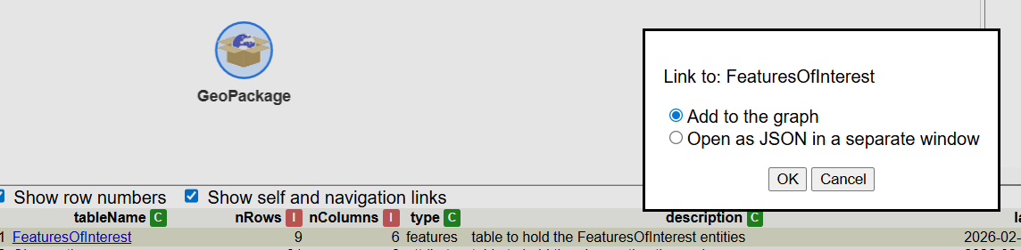 We are interested in two tables, the observations table and the feature of interest table. We can open both tables by clicking on the link and request adding them to the graph: