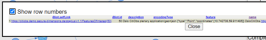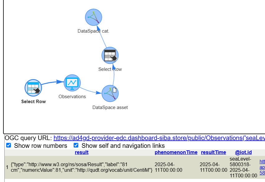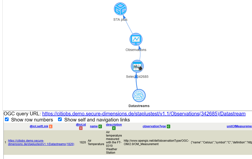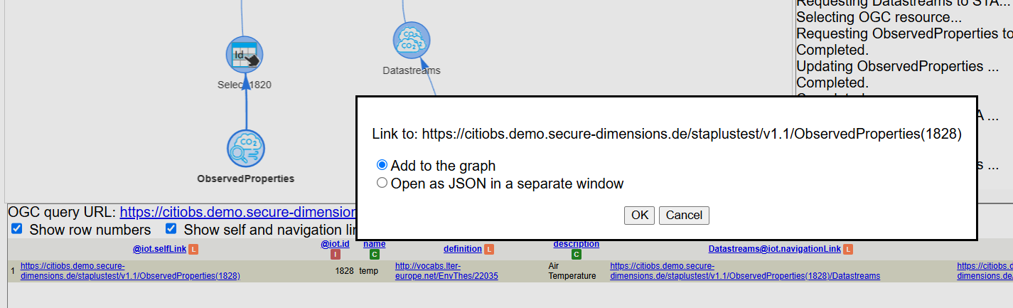 To know about the "Datastream" of the first Observation in the table we can click on the link in the table under the "Datastream@iot.navigationLink" column name. As a result the graph will be enriched with a "select resource" tool (with the label indicating the id of the Observation) and a "datastreams" tool