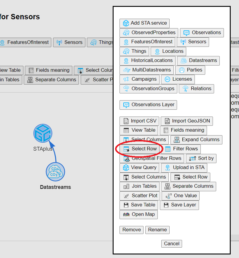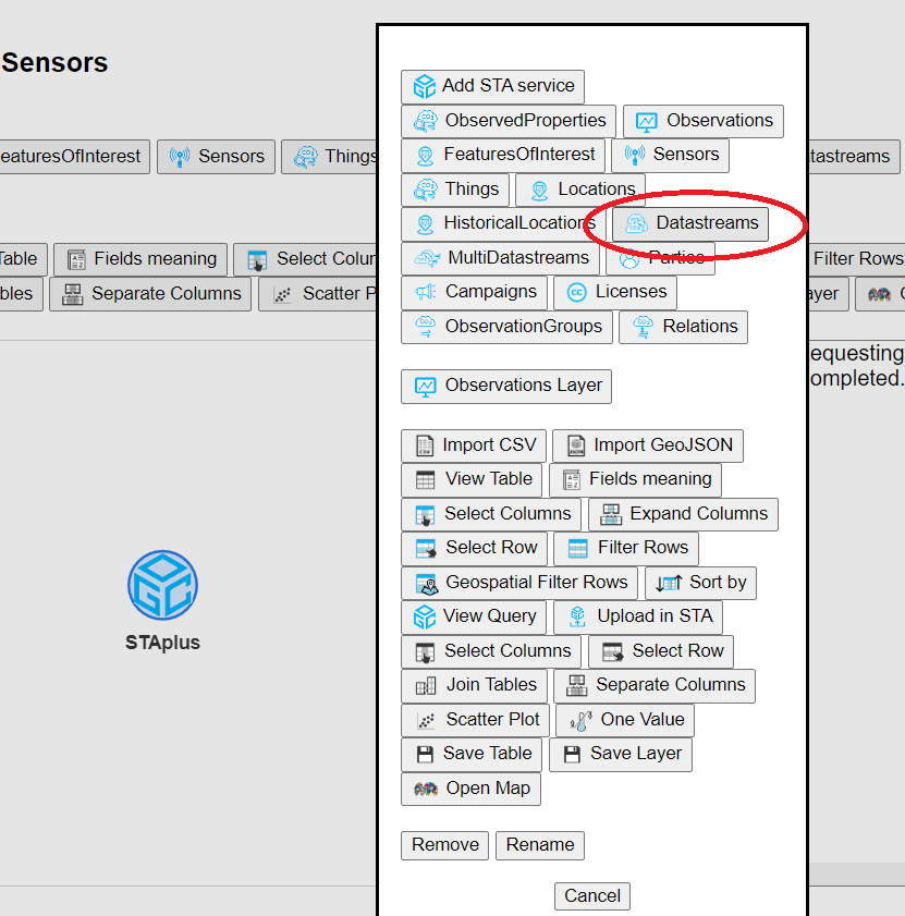 We will start by using the "Add STA service" tool to type the URL of the landing page of our favorite STAplus service. We will connect it to observations to get the "Observations" stored in the service.