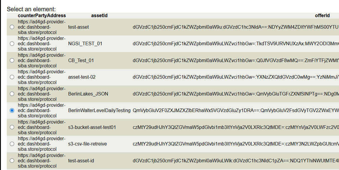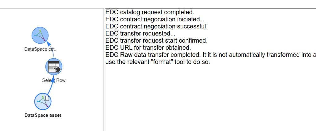 Now, we have to operate with the asset using the "Dataspace asset" tool. The three remaining steps related to contract negociation and data transfer are exectuted automatically (in this particular case, we are providing a blank contract to negotiate because we know that the dataset has no restritions)