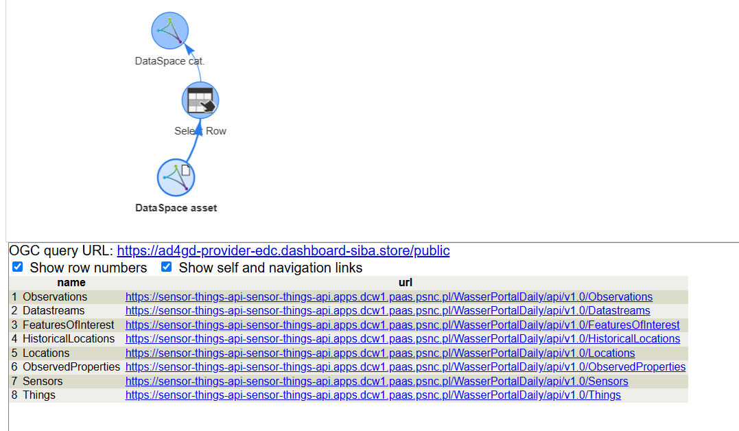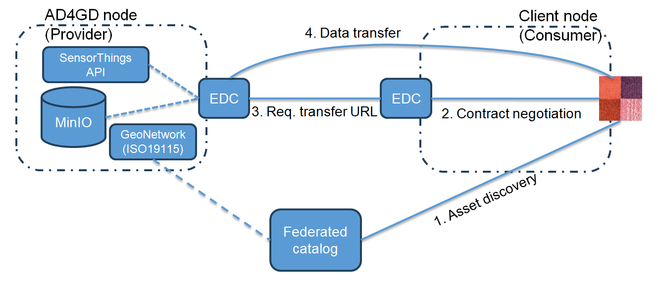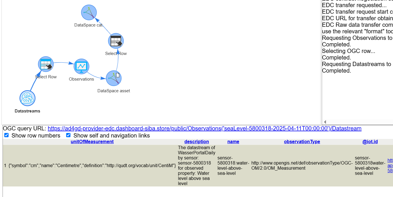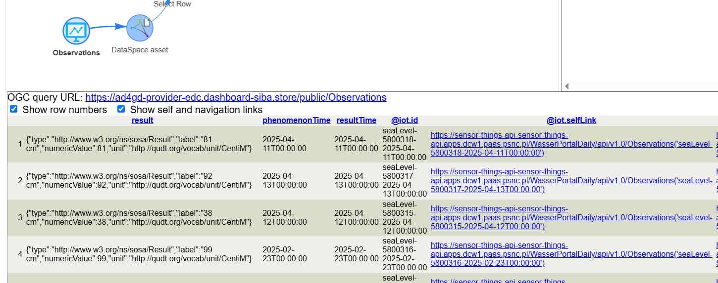In preparation for this example, we configured a SensorThings API (STA) endpoint as a asset available in the data space. Our demonstrative data space is composed by two nodes, each one with an Eclipse Data Connector instance. To get access to the STA asset a sequence of steps need to be conducted. Fortunately, TAPIS takes case of those steps automatically. The steps are:
