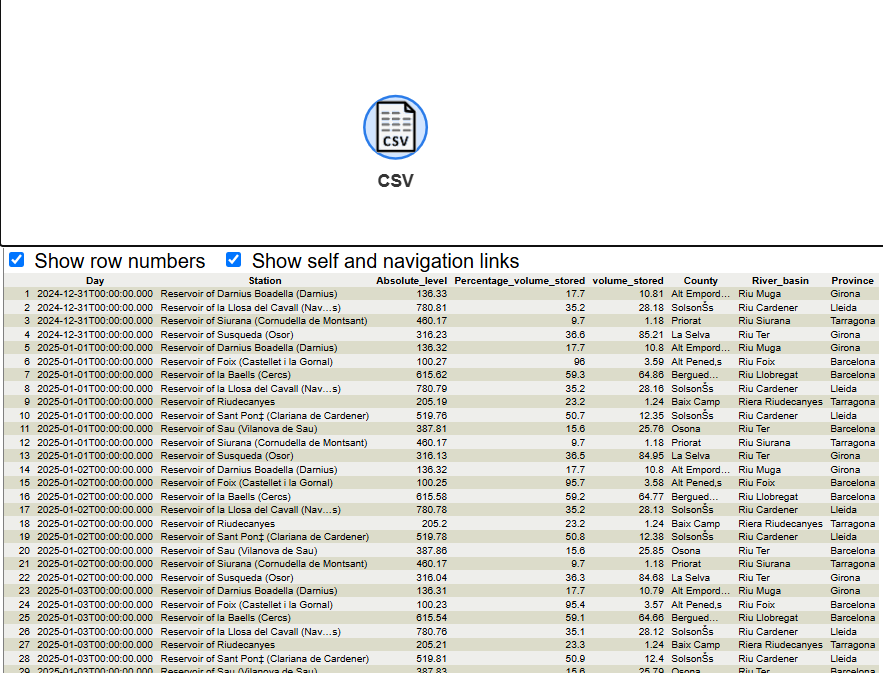 To start the exercise, need to find a CSV in the Internet. In this case, we go to the Open data portal of the Catalan Government to find a dataset of quantity of water in the Catalonia reservoirs