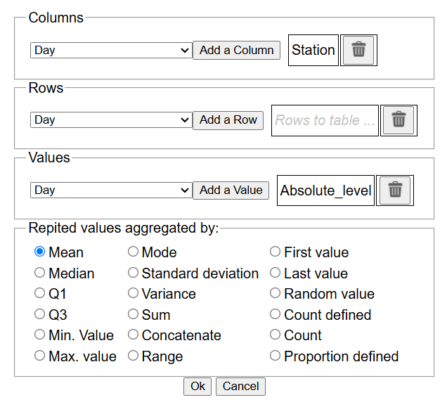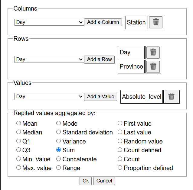 Now we link the "pivot table" tool to apply the desired changes to the current table. After clicking it, the dialogue allows for adding the values to different places. It is not allowed to repeat names of Columns and Rows, and at least one column has to be added to each section. The tool is inspided by the Excel pivot tables tool, in which collumns that need to be preserved from the current table should be selected in one of the sections to appear in the new table.