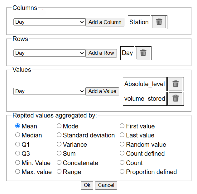 The rest of the columns are all the unique values in the original "Station" column (attribute selected in Column section). Every unique value is now a new columns. As only one attribute has been selected, these columns only appear once, with the value as column name. Every result in the confluence was aggregated by the selected option chosen.
