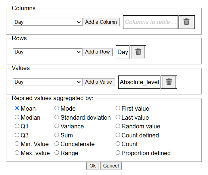 Next you can see a fragment of the result of this execution. In this case, the "reference column" is "Day", with all unique values, in the original column (attribute selected in Row section).