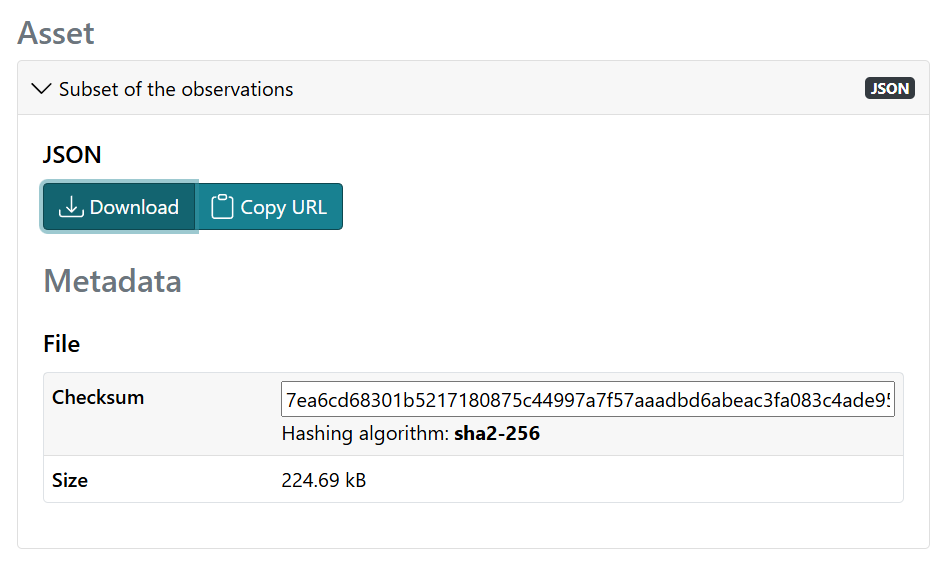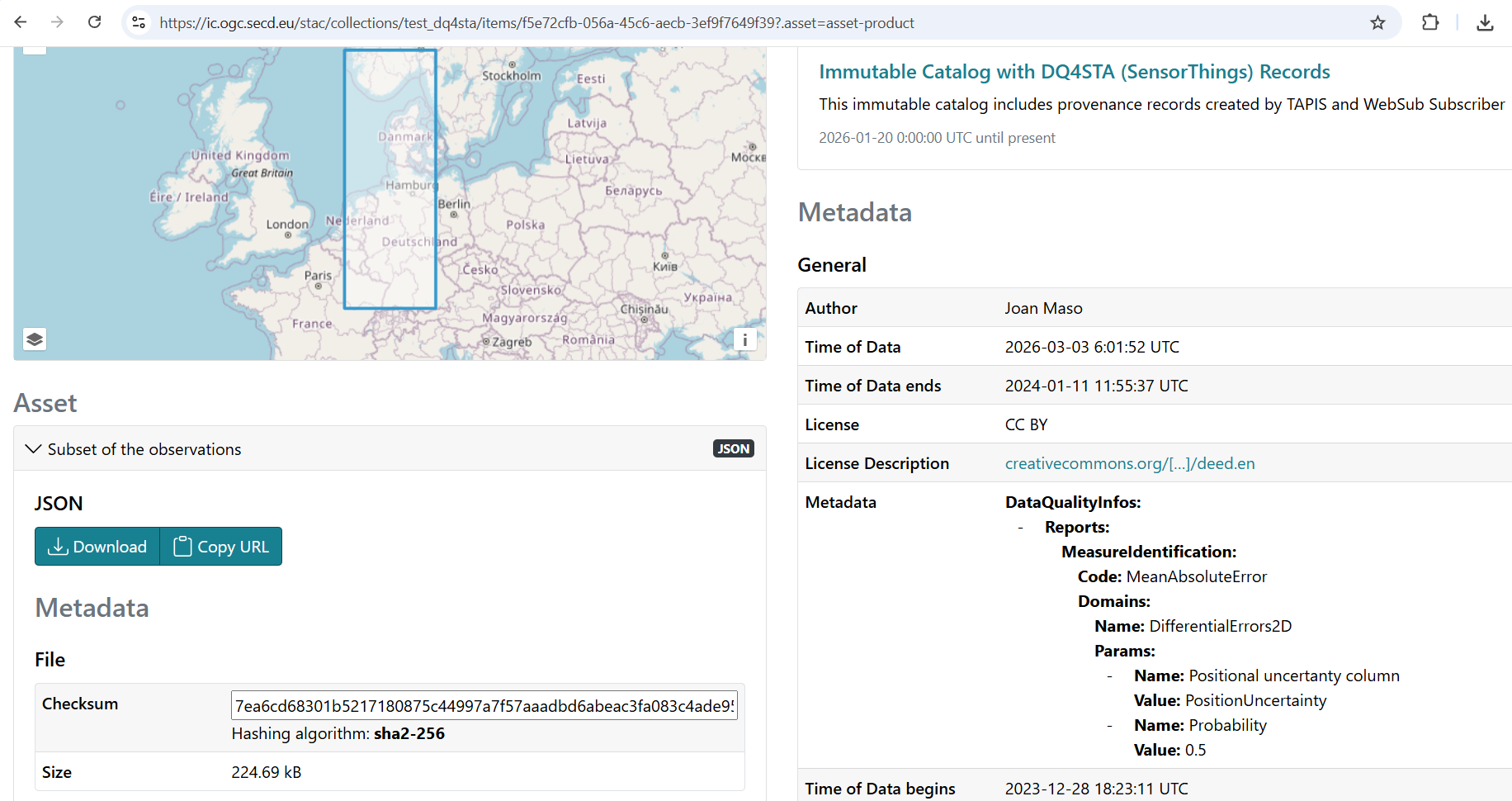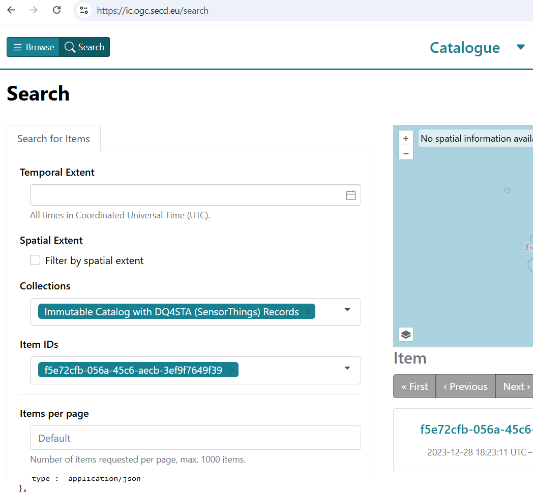 You can take the first part of the URL to go to the STAC catalogue (in my case https://ic.ogc.secd.eu/), select the Search botton and request the right collection (in my case Immutable Catalog with DQ4STA 'SensorThings' Records) and use the last part of the URL provided as the item Id (in my case f5e72cfb-056a-45c6-aecb-3ef9f7649f39).