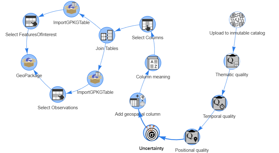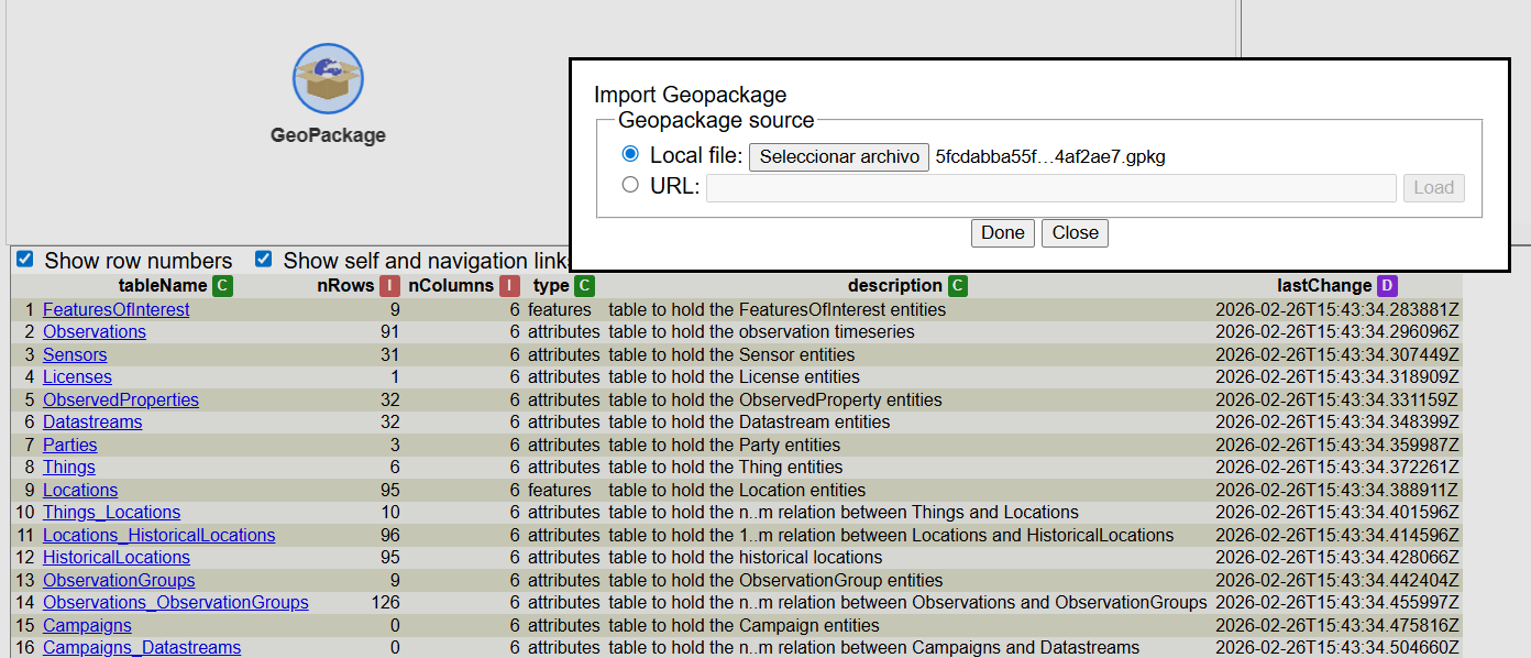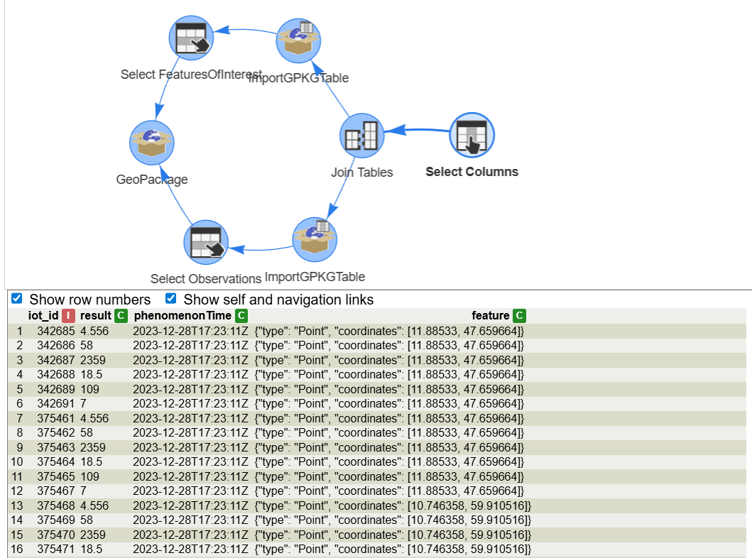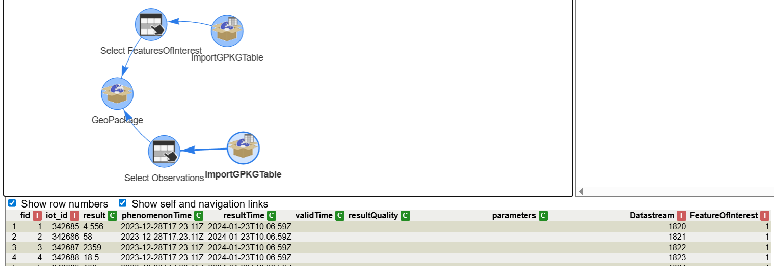 In this example, we will start by a table containing a geopackage that represents the content of a SensorThings API. The same exercise could be done getting the data directly from a STA. These are the necessary steps: