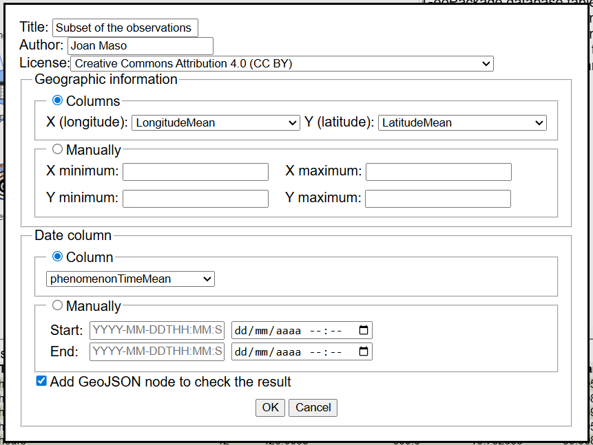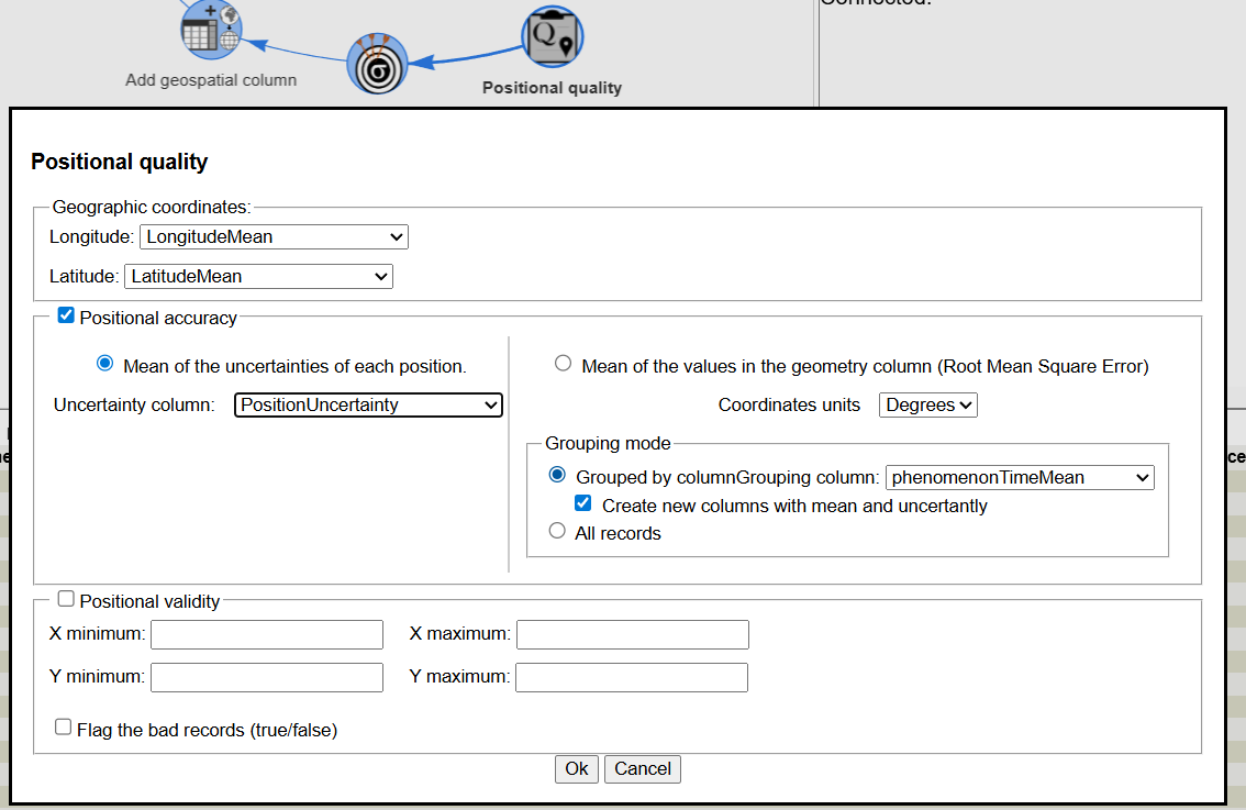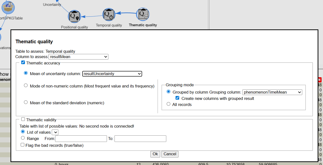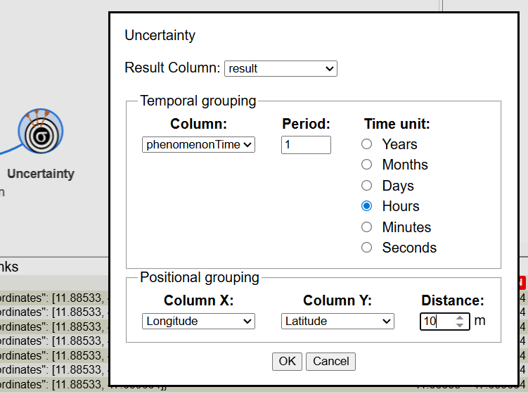 Finally, we got a table with positions, times and observation values. We are ready to compute the uncertainties based on the redundancies no the dataset. We need to select the 4 columns that represent, thematic values, time and positional and specify a temporal period and a positional distance that specifies observations that will be considered the same because they are close in space and time.