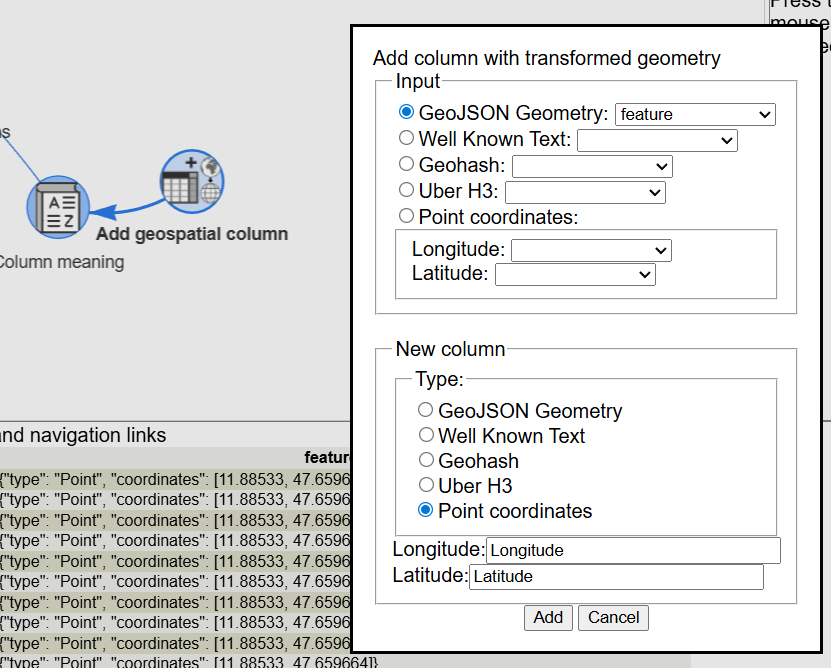 The feature element includes the position in a format that is not easy to deal with. With the tool Add a geospatial column we will be able to create two columns with latitude and longitude.