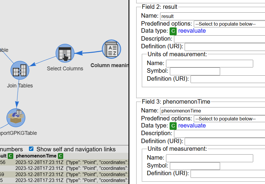 The result has the right content, but the data type of result and phenomenonTime is the intended one. To fix that, the column meaning tool has a reevaluate that will be handy. By pressing the link in both column descriptions, we will get the data types corrected.
