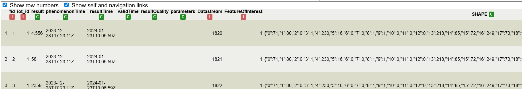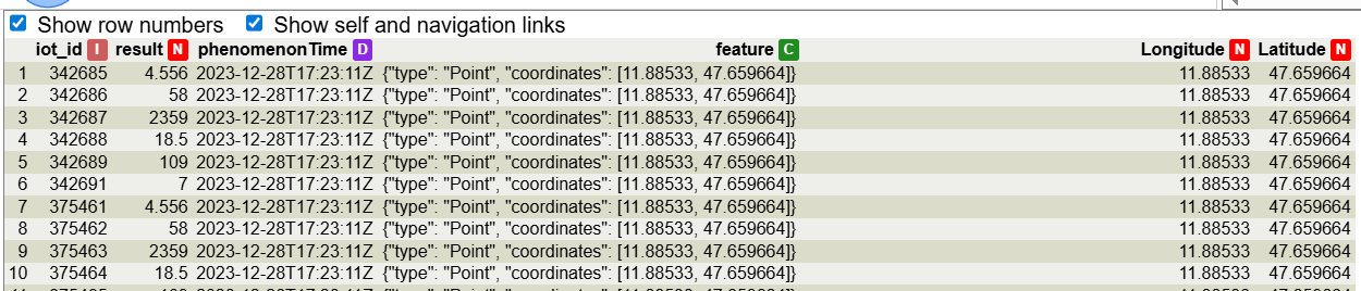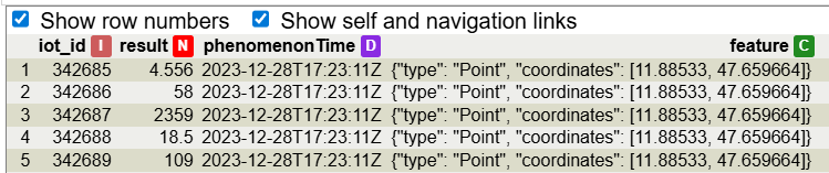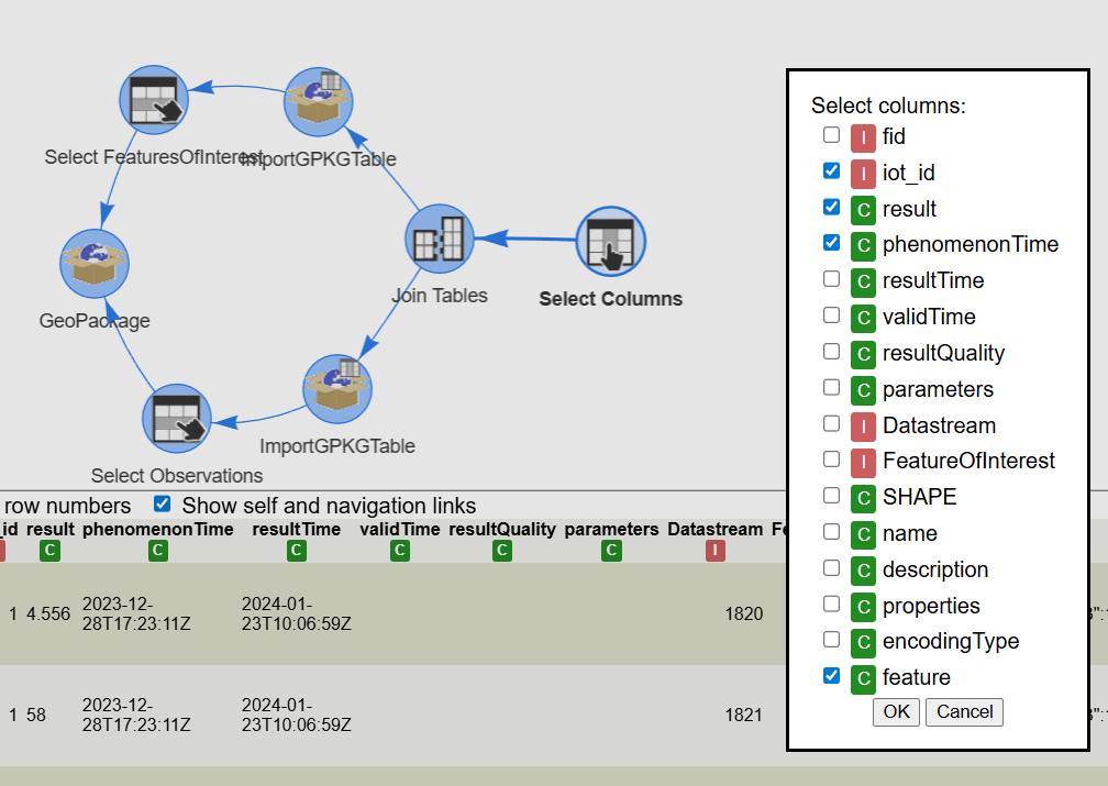 Next step is joining both tables into a single table using the feature of interest identifier as a join key. In the observations table the key is called FeatureOfInterest and in the featuresOfInterest table is called iot_id:
