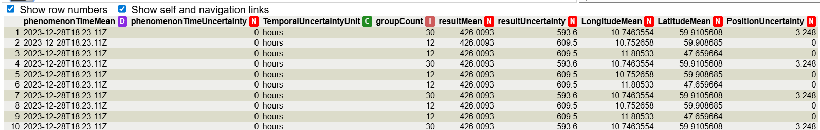 Unfortunately, there is no mention of the variable or the units of measure in the graphic. This is because this information is not on the Observations entity but in the previous entity: Datastream. We can see the properties of Datastream such as name, description and unitOfMeasurement. In here we see one of the limitations of the tabular common representation used in TAPIS: in property that is an object its values are represented as JSON serialization.